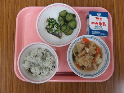 わかめごはん、牛乳、大根のうま煮、鰆のねぎ塩焼き、ピリ辛きゅうり