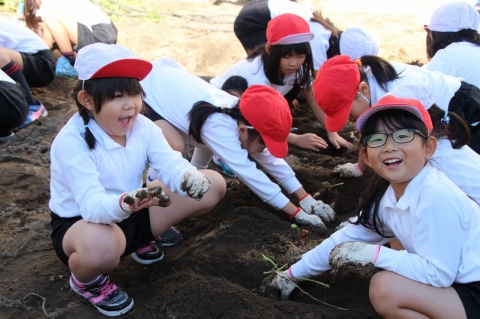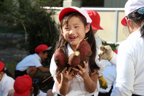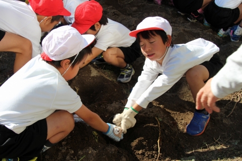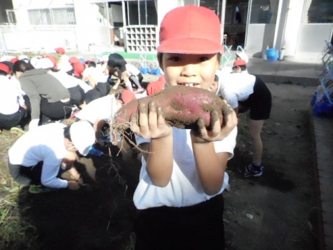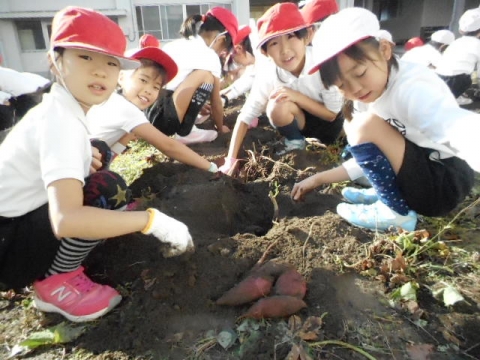 今日はお天気にも恵まれ、1年生と2年生が中庭の畑のサツマイモを堀りました。