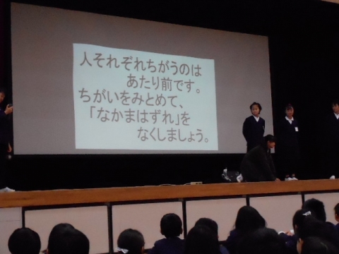 「人それぞれちがうのはあたり前です。ちがいをみとめて、なかまはずれをなくしましょう」