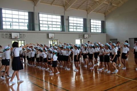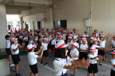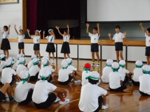 運動会に向けて、赤・青・黄・緑の各ブロックごとに分かれての練習が始まりました。2時間目の後の15分間が練習の時間です。
