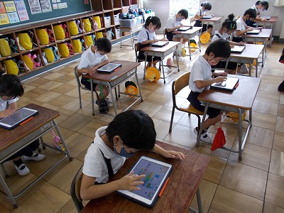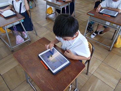 今日は講師の先生に来ていただき、1年生と3年生でプログラミング教育の授業を行いました。1年生は、キャラクターを動かすプログラムを自分で考えながら、熱心に取り組んでいました。