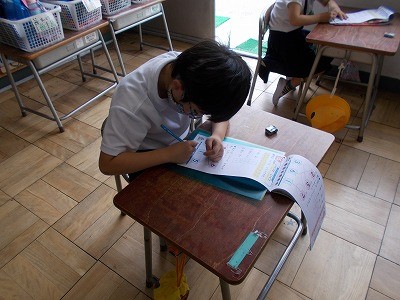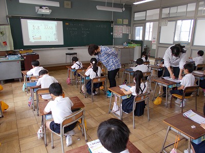 今日は1年生が算数で「いくつといくつ」の授業を行いました。「10をつくってあそぼう」というゲームを行った後、計算ドリルでおさらいをしました。