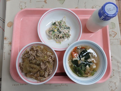 豚丼(ごはん、豚丼の具)、牛乳、愛西三つ葉のツナマヨ和え、豆腐汁