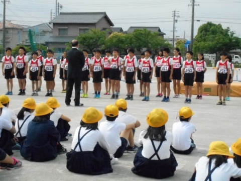 運動場で、6月2日(土)に開催される愛西市小学校陸上競技会に出場する選手の皆さんの激励会を行いました。