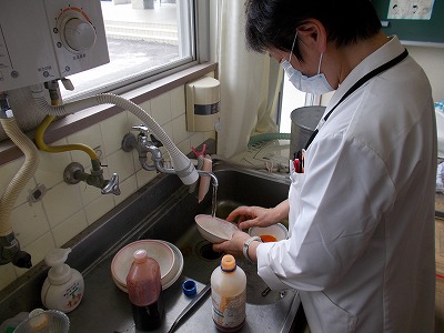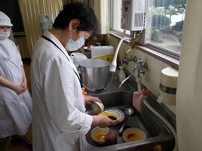 今日は、給食で使用している食器の残留物検査を行いました。学校薬剤師の先生が、試薬を使って食器や食缶の洗い残しを検査しました。安心安全な給食を提供できるよう、定期的に実施しています。
