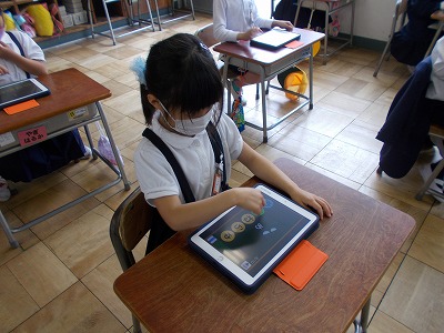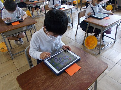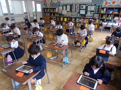1年生でもタブレットを使った勉強を始めています。今日はタブレットを教室に運んで、ひらがなのゲームなどを行いました。みんなでたのしく取り組むことができました。