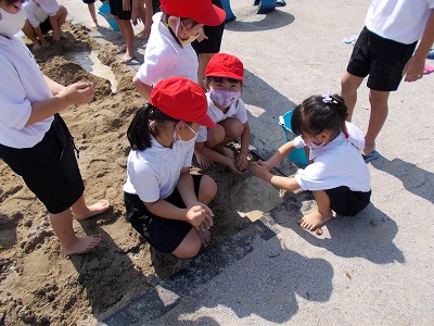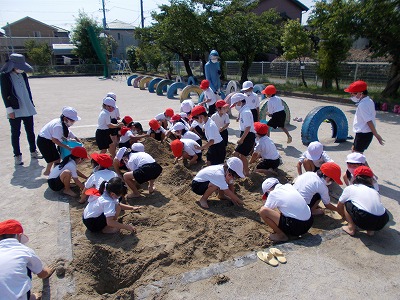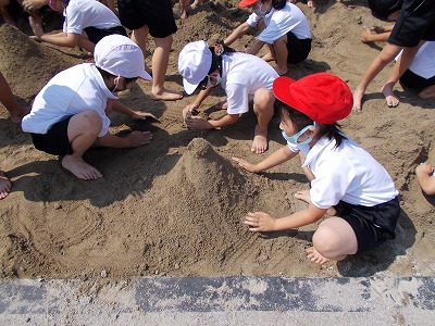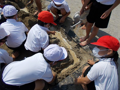 今日は1年生が図画工作で「すなやつちとなかよし」の授業を行いました。みんなで砂場に行き、山を作ったり水を流して川や池を作ったり、泥団子を作ったりしまし。協力して楽しく取り組むことができました。
