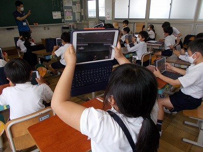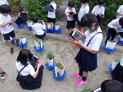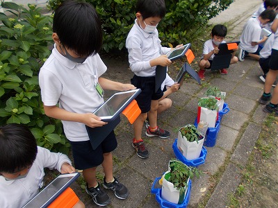 2年生でもタブレットを使った授業が始まっています。今日は教室で写真の撮り方を確認した後、中庭に移動し、自分が育てているミニトマトの記録写真を撮りました。