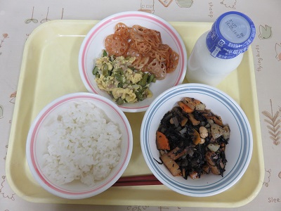 ご飯、牛乳、ひじきのうま煮、れんこんチップス、アスパラとベーコンの卵炒め