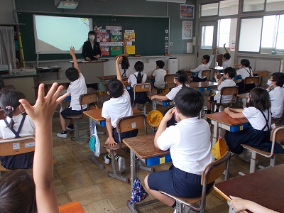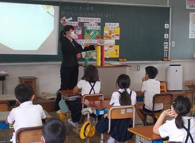 今日は、教育実習の先生が3年生で食育の授業を行いました。食べ物には色々な働きがあることを知り、バランスよく食べることの大切さについて考えました。