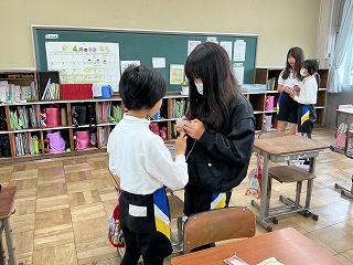 5年生は、朝の時間「らっこタイム」に対話カードをしました。カードに書かれたテーマについて、学級の仲間に伝え合いました。外はあいにくの天気でしたが、どの子も明るい表情で会話を楽しみました。