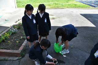 4年生は、理科の学習で、四季の移ろいの中で植物はどのような変化をするのかを調べることにしました。観察する植物を育てるために、ヘチマの種を植えました。これから毎日、子どもたちが熱心に水やりをしていきます。暑さに負けず、ぐんぐん育ってほしいです。