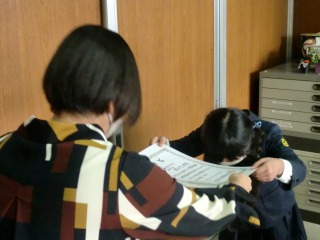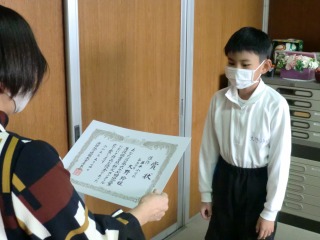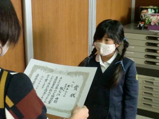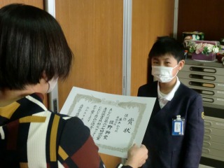 今日の昼放課に、校長室で認証と表彰を行いました。