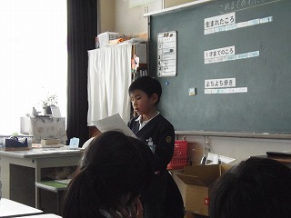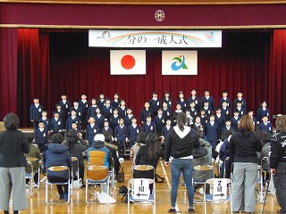 四年生では、二分の一成人式を体育館で行いました。壁面に等身大の自分の絵を飾って、1年生で入学してからのからだの成長を発表しました。その後、色紙に書いた将来に向けての気持ちを一字で表したものとその気持ちを発表し、家族に手渡しました。ちょっぴり照れた様子が可愛らしかったです。最後に、全員でこれからも頑張る気持ちを歌に乗せて元気よく歌いました。1年生からの成長を感じ、お家の方も目頭が熱くなられた方もみえたと思います。