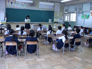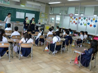 今日の草平タイムが始まる頃、1年生の廊下で原稿読みの練習をしている児童を見かけました。彼女たちはJRC生活委員会の児童で、明日実施予定の「緑の募金活動」の説明と、緑の羽根の配付をするために廊下にいました。
