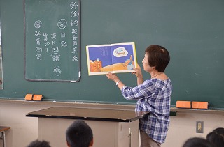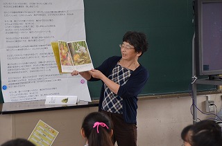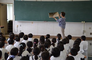 さらに、3時間目は2年生を対象に、「かぜのでんわ」「むしばいっかのおひっこし」「10+1ぴきのかえる」「おとん」「どすこいすしずもう」の5冊を読んでくださいました。2年生の子どもたちは、時に真剣な表情で、時には笑い声をあげながら、本の世界をたのしみました。