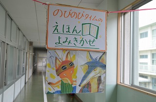 次に、のびのびタイムです。視聴覚室で低学年を対象に「ともだちや」などを読み聞かせてくれました。担当の方たちが、キツネの声、オオカミの声など、配役によってとても上手にセリフを言ってくださるので、子どもたちは大きな絵本にくぎ付けでした。
