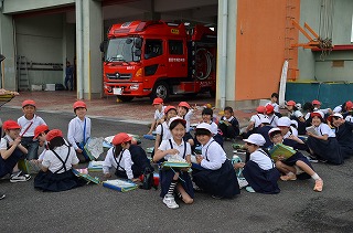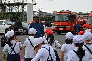 トイレ休憩を兼ねて寄らせていただいた消防署分署では、消防士さんからお話をうかがうことができました。消防車も近くで見ることができて、子どもたちはとてもうれしそうでした。