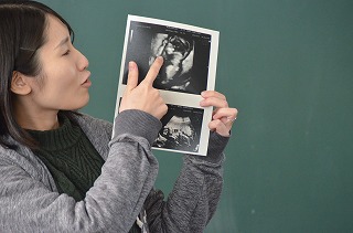 先生から5問のクイズが出されました。実際の妊娠の経過の様子やお腹のあかちゃんのエコー写真も提示されて、授業で学んだことと実際の命がリンクしていきました。Q&Aタイムでは多くの質問にも答えていただきました。
