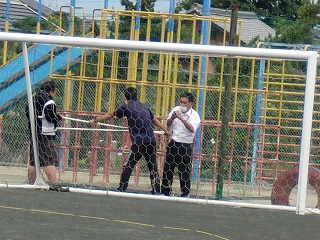 子どもたちは一斉に走って教室に戻ります。運動場では、教務の櫻井先生と校務の原野先生が不審者を「刺股(さすまた)」で捕まえようと闘っています。遊具の方まで移動したため、全校に体育館への避難の放送が流れます。担任が先頭で体育館へ移動をしました。