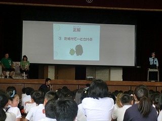 体育館で人員確認を行った後、校長先生からお話がありました。地震などの避難訓練同様に、①あわてず 落ち着いて ②声を出さず指示を聞く ことを大切すること。また、訓練のための訓練にはならないよう、実際に起きた時に臨機応変にどう動いたらよいかを考えることができるように。自分の命は自分で守る行動をとることの大切さについてお話がありました。
