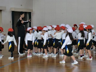 1組・2組合同で、体育館にいました。整列の練習です。どうしてもお話をしてしまい、静かに行動することができない子もいました。中には、しっかり口を閉じて、列を意識しながら「前へ習え」をしている子もいます。とても立派です。