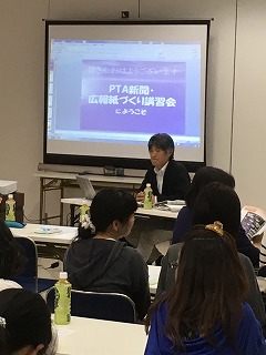各校のPTA委員の中で、名称は様々でしょうが「広報担当」の方々が集まり、新聞づくりのノウハウについて教えていただきます。草平小学校PTAからも3名の委員さんが参加しました。