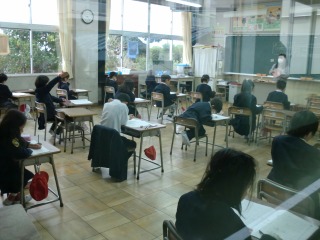 学校中どこを歩いても、2年生以上は教室の廊下の窓や扉はぴっしりと閉められ、中の様子を見ることはできませんが、中からは紙の上を走る鉛筆の音と時々咳をする音しか聞こえてきません。1年生の窓だけが透明のガラスだったので覗き込むと、いつもは元気よく授業を受けている子どもたちが、一生懸命に問題用紙を見ながら考えています。四月のことを思うと、大きく成長したと感じました。わかくさ学級の子どもたちも、個別でテストを実施していました。