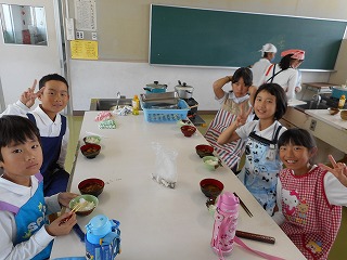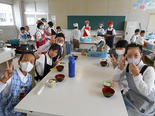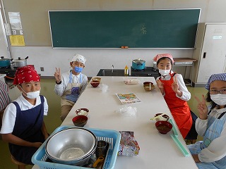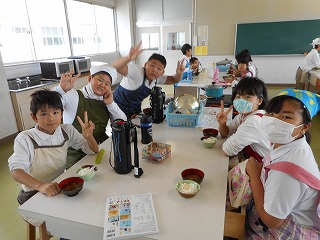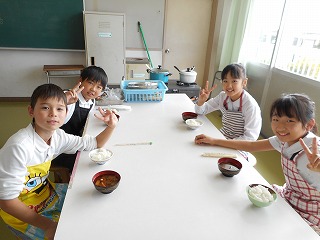 今日は、1・2時間目に、5年2組が調理実習を行いました。昨日1組が行った、お鍋でのご飯とお味噌汁づくりです。煮干しのだしをきちんととったお味噌汁は、いつものお味噌汁と少し違た味になっていると思います。ごはんの水加減も上手にできて、おいしいご飯が炊きあがりました。子どもたちの笑顔が、出来栄えを物語っていますね。