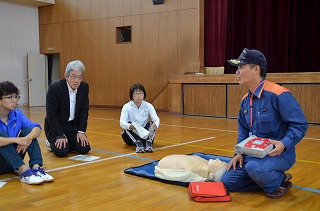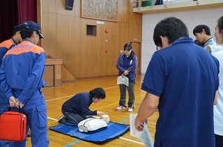 今日は、愛西市消防署分署より三名の消防士の方に来ていただき、心肺蘇生とAEDの職員研修を行いました。