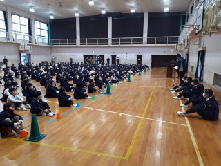 今日は、1年9か月ぶりに体育館で全校朝礼を行いました。ソーシャルディスタンスを取るために、舞台を正面にするのではなく、体育館の西の壁面が正面になるように隊形を工夫しました。