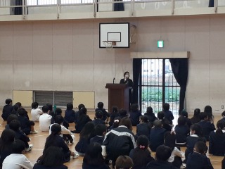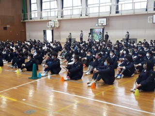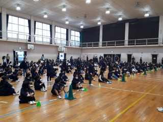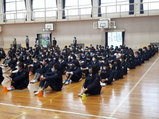 初めてのことなので、事前に教務や校務の先生が目印を置いて、誘導しやすいように工夫をしてくれました。どの学年も整然と入場し、全員が揃うまで静かに待つことができ、すばらしい取組でした。少し遅れてきた1年生も、体育館の静かな空気にびっくりして、思わずそろりそろりと歩きだす子もいました。