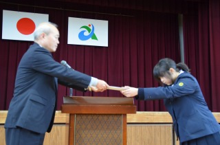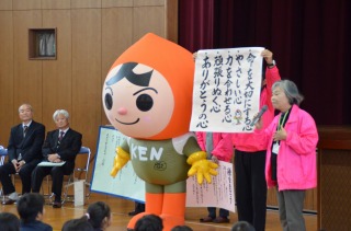 を大切にしましょうと話がありました。児童会長の渡邉君のお礼のことばで、贈呈式を締めくくりました。