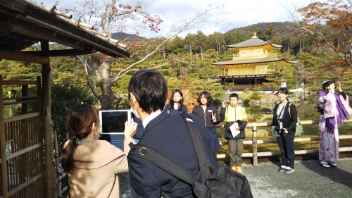 二つ目の見学地、金閣寺を見学しました。銀閣寺の落ち着いた赴きとは違った、金色の光を放つ金閣寺を見て、思わず声があがるほどでした。