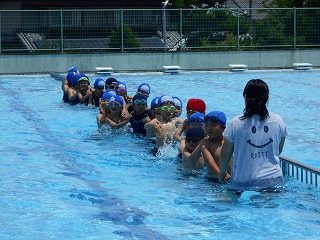 温水シャワーを浴びたあと、やっとプールに入ることができました。「冷たーい!」「楽しい~!」とそれぞれが感想を言いながら、笑顔でいっぱいでした。