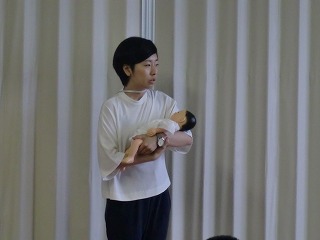次に愛西市の保健師さんからのお話があり、その後赤ちゃん人形で横抱きと縦抱きの練習をしました。新生児と同じくらいの重さや大きさの人形を、大切そうに抱っこしていました。