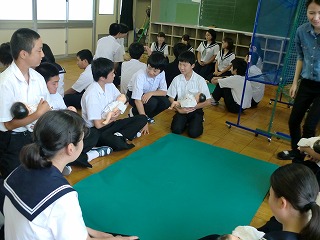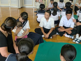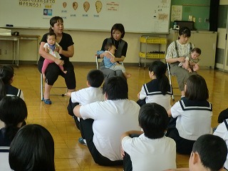 いよいよ本物の赤ちゃんとの対面です。地域のお母さんが協力してくれ、今日は6か月と8か月の女の子二人と、11か月の男の子の3組の親子が来てくれました。最初にお母さんから、妊娠中や出産のときのことや、子育てをしていて感じることなどのお話がありました。どのお母さんからも、赤ちゃんへの愛情の深さや子育ての大変さと喜びが感じられました。