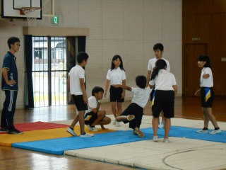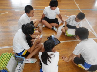 後半は、集団演技を練習します。場所が2つなので、4グループを2つに分けて、音楽を流しながら半々に練習をします。そして、演技の様子はiPadで録画をします。残りの2グループは自分たちの演技をより良くするための話し合いをします。5分ずつで交代しながら、2クール行います。子どもたちの演技は、大人が考えるよりも自由で柔軟な発想で、馬跳びや組体操を入れたり、横転がりをしている子の動きを利用して、飛び込み前転をしたりと様々な工夫がみられました。