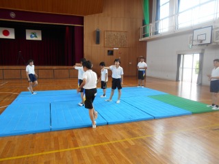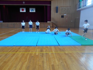 6年生は、器械運動の中でも「マット運動」に取り組み、個人種目のマット運動の技をさらに楽しくするために、「集団マット」の演技に取り組んでいます。
