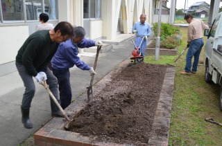 今日は愛西ライオンズクラブの方々が、中庭の花壇を耕しに来てくださいました。「アイリンブループロジェクト」の準備のためです。