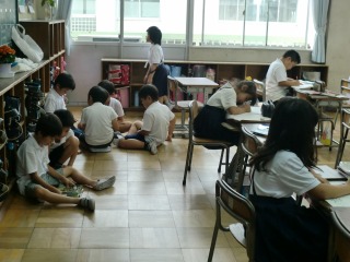 また、あいにくの天気で水泳の授業もできず、運動場でも遊べず、子どもたちは時間を持て余している子もいます。そんな状況の中、どんな風に過ごしているかと教室を覗くと、部屋でカードゲームをしていたり、渡りの掲示物を友達と仲良く見学したりと、危険がないように考えて遊んでいました。みんな工夫しているなあと感心しました。