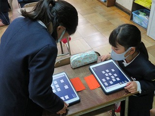 ?”を使って、相手に欲しい食べ物を尋ね、カードを送ろう」というものでした。友達とやりとりをしながら、自分のタブレットに送られてくる食べ物のカードを見て、どの子も嬉しそうでした。
