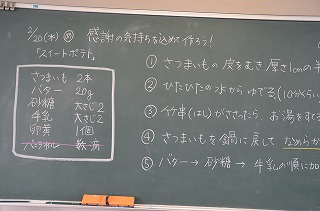 明日の授業参観に向けて6年生は「調理実習」を行いました。「スイートポテト」作りに取り組みました。1・2時間目は2組、3・4時間目は1組でした。