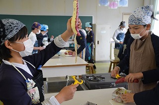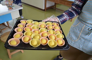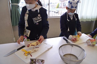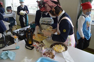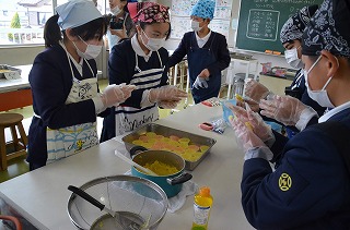 まず、先生の説明を聞いてから実習に入りました。サツマイモの皮をむいてから、半月切りをするときにちょっと苦戦しました。いもの形が様々で、押さえづらく切りにくかったようです。さらに、イモが意外にかたく、切る姿を見ていてはらはらしました。柔らかくなったイモをつぶし、砂糖やバター、卵黄を入れてスイートポテトを作りました。作る途中で卵を握りつぶしてしまったり、つぶすときにこぼしてしまったりしましたが、調理する機会が少ない子にとっては貴重な体験でした。