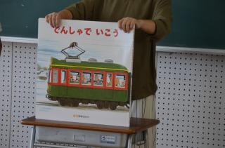 続いてのびのびタイムには、視聴覚室での読み聞かせでした。低学年の子どもたちが集まってきました。最初に「きょだいな きょだいな」のお話を読んでもらいました。巨大なトイレットペーパーが転がったり、巨大な泡だて器で雲が発生して雨を降らしたりと、とても楽しいお話でした。次は、6年生の女の子3人が、一緒に読み聞かせを行いました。「でんしゃでいこう」のお話でした。「デデン ドドン」と電車が走り、「ゴー」とトンネルを抜けると、雪野原や雪山、海辺や菜の花畑などいろいろな場所にたどり着くお話で、絵がとてもきれいでした。走る場所によって、電車の走る音が変わるので、それを工夫して読んでいました。お話が終わると、大きな拍手が起こりました。