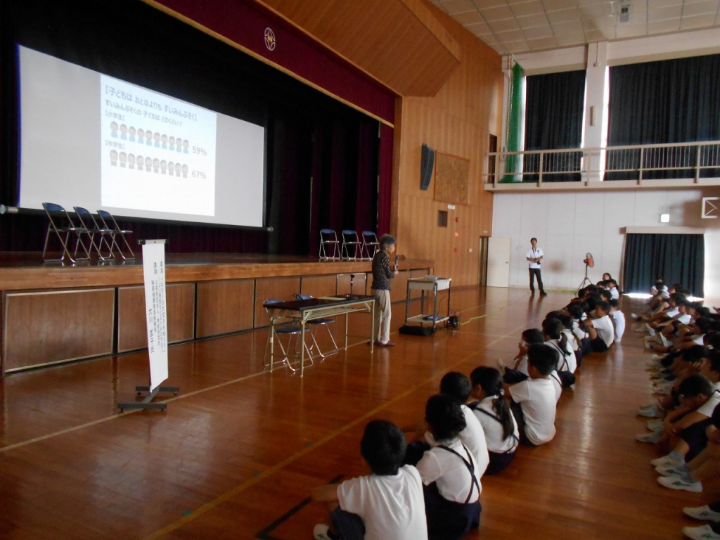 今日は、2時間目に、4~6年生と保護者の方を対象に学校保健委員会を行いました。公益財団法人 神経研究所 睡眠健康推進機構長 大川匡子氏を講師にお招きし、「ねむりの大切さを知ろう」という演題でお話を伺いました。よい睡眠をとるために、朝のポイント、昼のポイント、夜のポイントがあるそうです。朝のポイントは、「朝起きたら、カーテンをあけて、太陽の光をしっかりとあびること」「朝起きたら、部屋を明るくして朝ごはんをしっかりと食べること」です。昼のポイントは、「学校から帰って、夕方ねないこと」「どうしても眠いときは12~15時の間に、10~15分ぐらいの短い昼寝をすること」です。そして、夜のポイントは、「部屋の明かりを少し落とすこと」「寝る前に激しい運動をしたり、あついお風呂に入ったりしないこと」「インターネットや携帯電話は控えること」です。リラックスして寝ることも大切で、体をリラックスさせるための方法も教えていただきました。眠れないときは、是非実行してみてください。よい睡眠をしっかりととって、心も体もどんどん成長してほしいです。