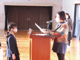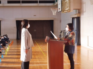 次に、愛知県教育委員会より、愛知県健康推進学校に草平小学校が認められていただいた賞状を、保健主事の先生に渡して披露しました。