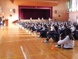 2回目となる体育館での全校朝礼を行いました。前回は足音を立てて入場していた1年生も、静かに整然と体育館に入り、列の整とんを行っていました。とても立派な姿でした。