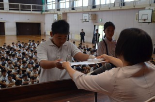 朝のあいさつの後、歯の健康優良児の表彰があり、6年2組の村瀬大輔君と6年1組の中村まりさんが表彰を受けました。この二人は、う歯がないのはもちろんですが、歯肉の状態や歯列も良好です。歯は一生の宝物です。これからも正しい歯磨きをし、歯医者でのメンテナンスを行って、いつまでも健康な歯でいてほしいと思います。