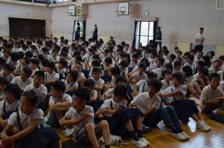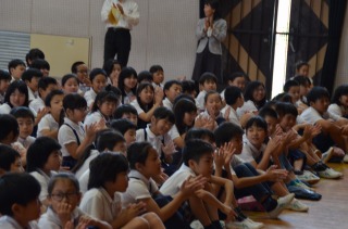 校長先生のお話の前に、座ってできる体幹呼吸法を行いました。背筋を伸ばした体操座りの姿勢で、4呼間でしっかりと息を吸い、8呼間で「はあ~」とゆっくり息を吐きながらできるところまで右の方へ体をねじります。吐き切ったところで、4呼間息をとめて体が締まっているのを意識します。反対側も行います。授業と授業の合間にやると、からだがほぐれて授業への意欲も高まって効果的だそうです。